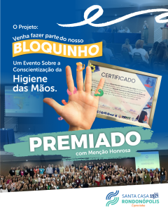 A Menção Honrosa foi conferida a Santa Casa Rondonópolis em detrimento do Projeto: Bloquinho de Higienização das Mãos. Um evento que visa a conscientização dessa Prática eficaz e sustentável.
