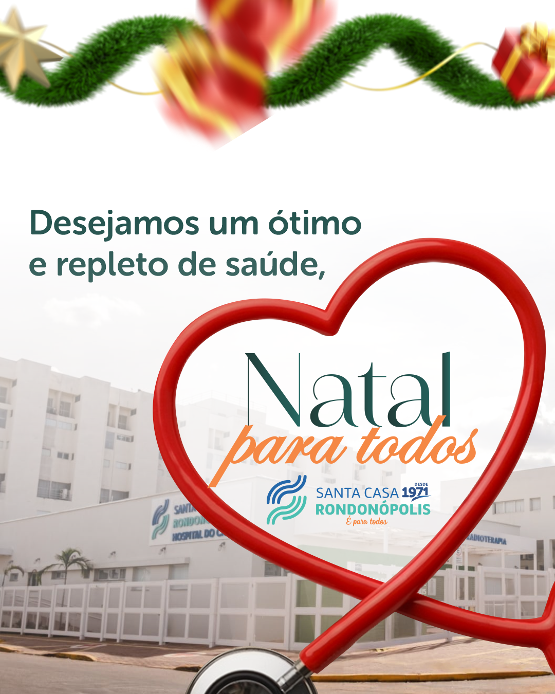 A Santa Casa de Rondonópolis deseja a todos os nossos pacientes, parceiros e amigos um Natal iluminado, repleto de paz, amor e saúde. Que este momento especial seja de união, gratidão e renovação, trazendo esperança e alegria para todos os corações. Feliz Natal!